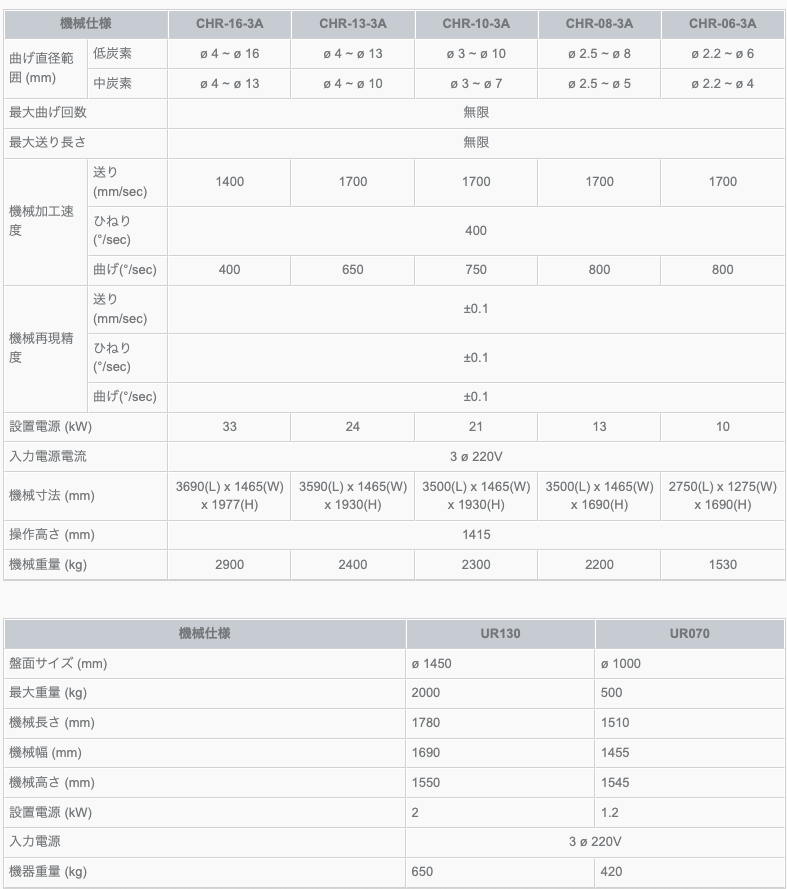 φ2.2〜16mmの幅広い線材径に対応可能なワイヤーベンドです。最大送り速度1700mm/s、曲げ速度800°/sの圧倒的スピードに加え、再現精度±0.1という極めて高い加工精度を両立。